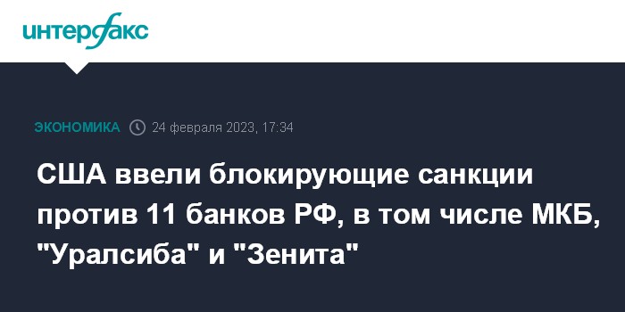Москва. 24 февраля. INTERFAX.RU - США ввели блокирующие санкции против ряда финансовых организаций, в том числе Московского кредитного банка (МКБ), банков "Санкт-Петербург", "Уралсиб", "Зенит" и МТС-банка, следует из сообщения Минфина США.