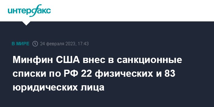 Москва. 24 февраля. INTERFAX.RU - Минфин США в пятницу включил в санкционные списки по России 22 физлица и 83 организации.