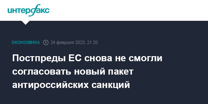 Москва. 24 февраля. INTERFAX.RU - Постпреды стран ЕС не смогли в пятницу согласовать десятый пакет санкций против России, сообщают европейские СМИ со ссылкой на источники.