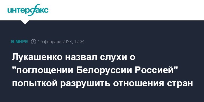 Москва. 25 февраля. INTERFAX.RU - Президент Белоруссии Александр Лукашенко считает, что слухи о "планах поглощения Белоруссии Россией до 2030 года" нацелены на разрушение связей Минска и Москва.