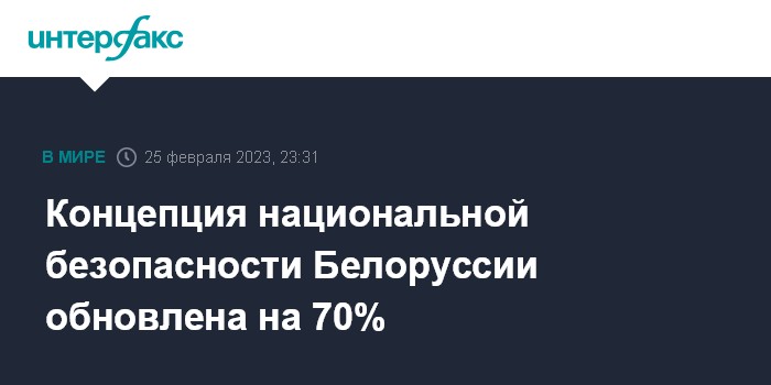 Москва. 25 февраля. INTERFAX.RU - Концепция национальной безопасности Белоруссии обновлена на 70%, хотя ее структура и основа остались прежними, заявил госсекретарь Совбеза Белоруссии Александр Вольфович.