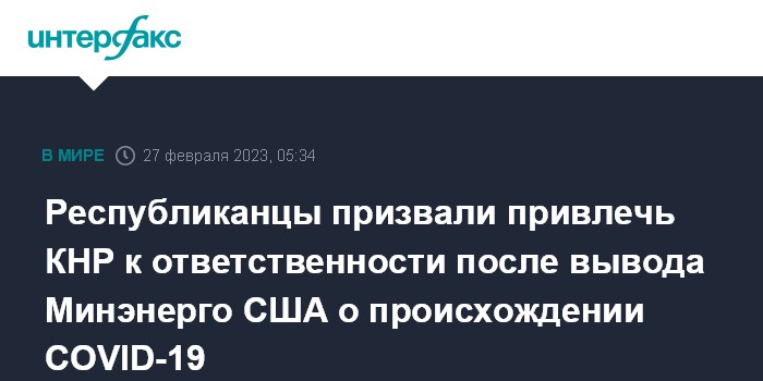 Москва. 27 февраля. INTERFAX.RU - Республиканцы призывают к незамедлительным действиям против китайского правительства, ссылаясь на новое заключение министерства энергетики США, в котором причиной вспышки COVID-19 названа утечка из лаборатории.