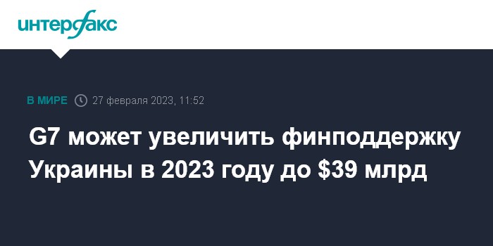 Москва. 27 февраля. INTERFAX.RU - Страны "группы семи" (G7) увеличили обязательства по бюджетной и экономической поддержке Украины в 2023 году до $39 млрд. Об этом говорится в совместном заявлении министров финансов и глав центробанков стран G7.