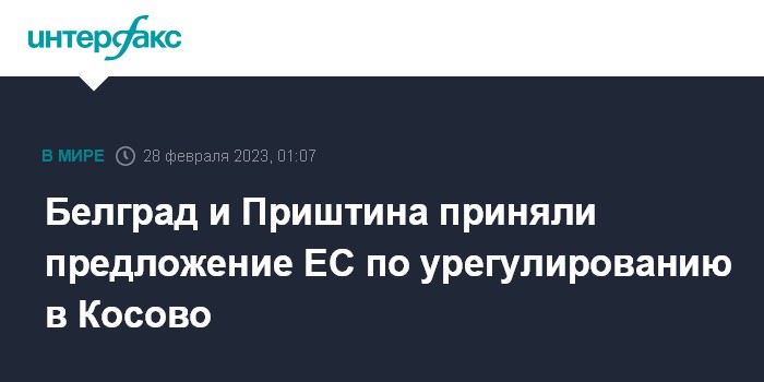 Москва. 28 февраля. INTERFAX.RU - Высокий представитель Евросоюза по иностранным делам Жозеп Боррель объявил, что президент Сербии Александр Вучич и глава правительства Косово Альбин Курти согласились с предложением Евросоюза по нормализации отношений между сторонами.