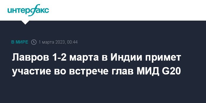 Москва. 1 марта. INTERFAX.RU - Глава МИД РФ Сергей Лавров 1-2 марта посетит Нью-Дели, где примет участие во встрече глав МИД G20, сообщила официальный представитель российского внешнеполитического ведомства Мария Захарова.