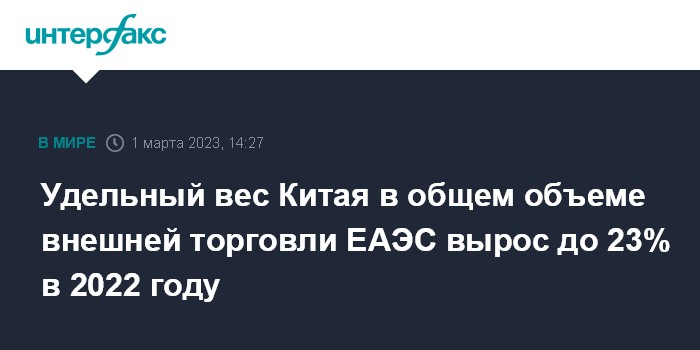 Москва. 1 марта. INTERFAX.RU - Удельный вес Китая в общем объеме внешней торговли Евразийского экономического союза увеличился и составил в 2022 году более 23%. Об этом сообщила на брифинге в среду официальный представитель Евразийской экономической комиссии Ия Малкина.