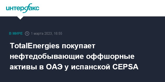 Москва. 1 марта. INTERFAX.RU - TotalEnergies подписала соглашение с испанской CEPSA о приобретении ее добывающих активов в Объединенных Арабских Эмиратах с датой вступления в силу 1 января 2023 года, сообщила французская компания.