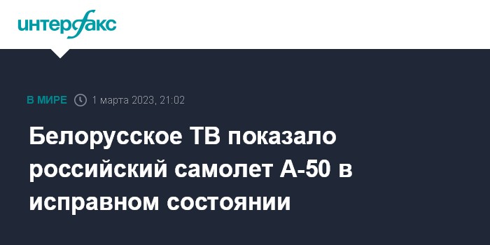 Москва. 1 марта. INTERFAX.RU - В эфире белорусского гостелеканала "Беларусь 1" в среду был показан в исправном состоянии российский самолет дальнего радиолокационного обнаружения и управления А-50, якобы ранее поврежденный при атаке дронов на белорусский военный аэродром.