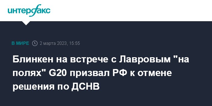 Москва. 2 марта. INTERFAX.RU - Госсекретарь США Энтони Блинкен при общении с главой МИД РФ Сергеем Лавровым "на полях" встречи глав МИД G20 призвал Москву пересмотреть решение о приостановке участия России в Договоре о стратегических наступательных вооружениях (ДСНВ), сообщает Associated Press (AP) со ссылкой на неназванного высокопоставленного американского чиновника.