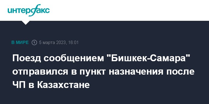 Москва. 5 марта. INTERFAX.RU - Пассажирский поезд сообщением "Бишкек-Самара", столкнувшийся в воскресенье с маневровым локомотивом на западе Казахстана, возобновил движение к пункту назначения, сообщила пресс-служба железнодорожной нацкомпании "Казахстан темир жолы" (КТЖ).