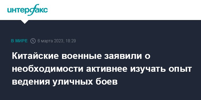 Москва. 6 марта. INTERFAX.RU - Народно-освободительной армии Китая (НОАК) нужно более основательно изучать опыт ведения сражений в городских условиях, заявил "на полях" сессии Всекитайского собрания народных представителей (ВСНП) генерал-лейтенант НОАК Ма Имин.