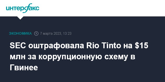 Москва. 7 марта. INTERFAX.RU - Комиссия по ценным бумагам и биржам (SEC) США оштрафовала Rio Tinto plc за нарушение закона о борьбе с практикой коррупции за рубежом (FCPA), которое выражалось в построении коррупционной схемы в Гвинее, говорится в сообщении комиссии.