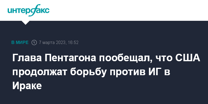 Москва. 7 марта. INTERFAX.RU - Министр обороны США Ллойд Остин, прибывший во вторник с необъявленным визитом в Ирак, заявил, что США привержены безопасности страны, продолжат бороться с "Исламским государством" (террористическая организация, запрещена в РФ).