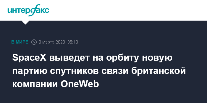 Москва. 9 марта. INTERFAX.RU - Американская ракета Falcon 9 в четверг стартует на орбиту с очередной партией из 40 британских спутников связи OneWeb, сообщает компания-разработчик носителя SpaceX.