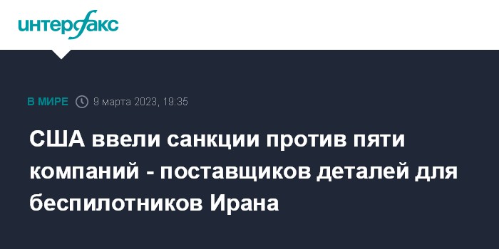 Москва. 9 марта. INTERFAX.RU - Минфин США в четверг объявил о санкциях в отношении пяти компаний, базирующихся в Китае, и одного физического лица в связи с поставками Ирану компонентов, которые можно использовать при производстве беспилотников.