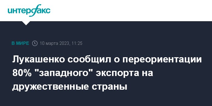 Москва. 10 марта. INTERFAX.RU - Белоруссия смогла перенаправить в восточном направлении 80% выпавшего из-за санкций экспорта на Запад, заявил президент Александр Лукашенко.