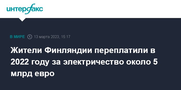 Москва. 13 марта. INTERFAX.RU - Жителям Финляндии из-за энергетического кризиса осенью прошлого года пришлось переплатить около пяти миллиардов евро, подсчитали для программы журналистских расследований телерадиокомпании Yle исследователи из университета Аалто.