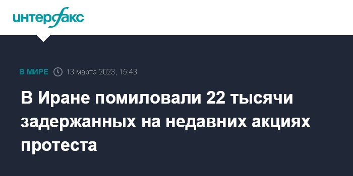 Москва. 13 марта. INTERFAX.RU - Руководитель Исламской республики Иран аятолла Али Хаменеи помиловал 22 тысячи человек, задержанных на недавних акциях протеста, сообщает AP со ссылкой на заявление главы судебной власти Ирана Голамхосейна Эджеи.