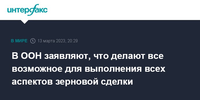 Москва. 13 марта. INTERFAX.RU - В ООН работают со всеми сторонами, имеющими отношение к заключенной в Стамбуле зерновой сделке, и предпринимают все возможные усилия для ее сохранения, заявил в понедельник представитель генсека ООН Стефан Дюжаррик.