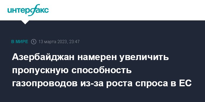 Москва. 13 марта. INTERFAX.RU - Президент Азербайджана Ильхам Алиев заявил, что Баку планирует расширять пропускную способность газопроводов в связи с растущим спросом на газ в европейских странах.
