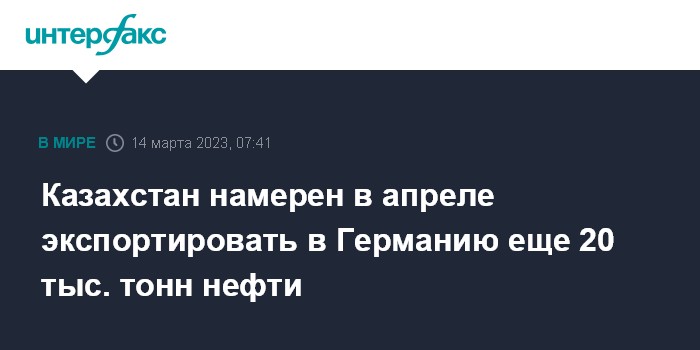 Москва. 14 марта. INTERFAX.RU - Казахстан планирует экспортировать в Германию в апреле еще 20 тыс. тонн нефти, по итогам 2023 года объем экспортированной нефти составит 300 тыс. тонн, сообщил министр энергетики республики Болат Акчулаков.