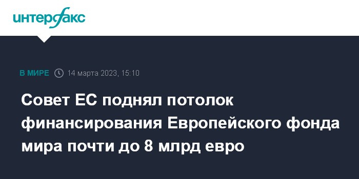 Москва. 14 марта. INTERFAX.RU - Совет ЕС объявил во вторник, что принял решение об увеличении финансового потолка Европейского фонда мира (EPF) до 7,979 млрд евро (в текущих ценах) до 2027 года, чтобы обеспечить возможность покрытия дополнительных потребностей в финансах.