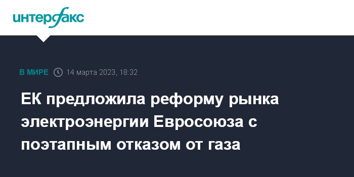 Москва. 14 марта. INTERFAX.RU - Еврокомиссия (ЕК) предложила во вторник реформировать структуру рынка электроэнергии ЕС для увеличения доли возобновляемых источников энергии, поэтапного отказа от газа, защиты потребителей от скачков цен, а также для повышения конкурентоспособности промышленности.