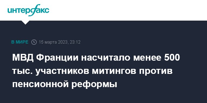 Москва. 15 марта. INTERFAX.RU - Около 480 тыс. человек приняли участие в среду в акциях протеста против пенсионной реформы во Франции, сообщили во французском МВД.