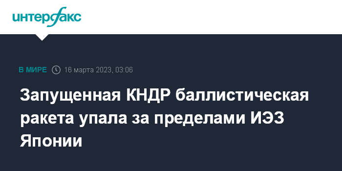 Москва. 16 марта. INTERFAX.RU - В Минобороны Японии сообщили, что запущенная КНДР в четверг утром баллистическая ракета упала за пределами исключительной экономической зоны Японии, передает японская телекомпания NHK.