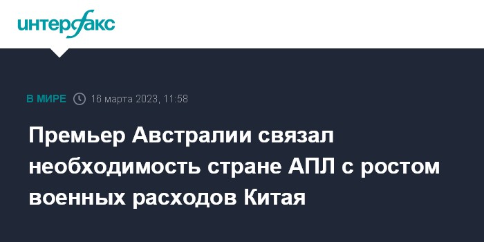Москва. 16 марта. INTERFAX.RU - Премьер-министр Австралии Энтони Албаниз, комментируя потребность страны в атомных подлодках, отметил, что Китай больше прочих стран инвестирует в военный потенциал, пишет The Sydney Morning Herald.