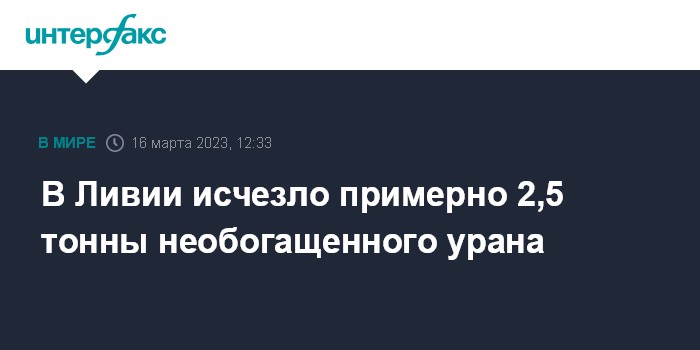 Москва. 16 марта. INTERFAX.RU - Инспекторы МАГАТЭ обнаружили, что около 2,5 тонн необогащенного урана, хранившихся на объекте в Себхе в 660 км к юго-востоку от столицы Ливии Триполи, пропали. Об этом сообщает в четверг Associated Press (AP) со ссылкой на данные агентства.