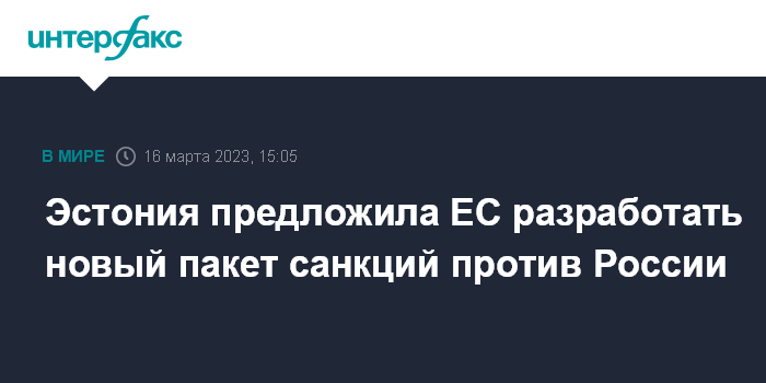 Москва. 16 марта. INTERFAX.RU - Правительство Эстонии предлагает Европейскому союзу разработать новый пакет антироссийских санкций, в котором одно из главных мест уделить сокращению доходов за счет поставок энергоносителей.