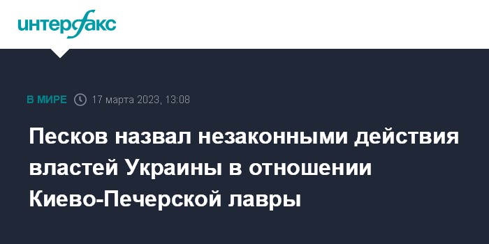 Москва. 17 марта. INTERFAX.RU - Действия украинских властей в ситуации вокруг Киево-Печерской лавры незаконны, заявил пресс-секретарь президента РФ Дмитрий Песков.
