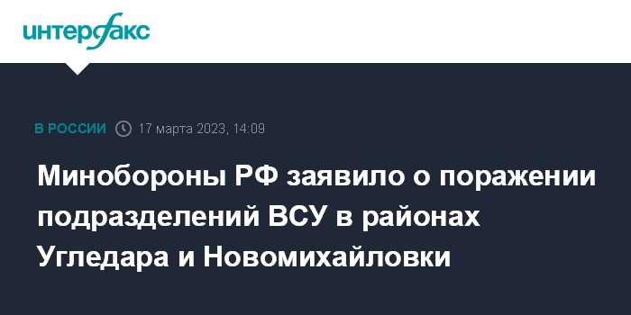Москва. 17 марта. INTERFAX.RU - Подразделения вооруженных сил Украины поражены в районах Угледара и Новомихайловки Донецкой народной республики, сообщил официальный представитель министерства обороны РФ Игорь Конашенков на брифинге в пятницу.