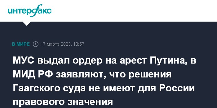 МУС выдал ордер на арест Путина, в МИД РФ заявляют, что решения Гаагского суда не имеют для России правового значения