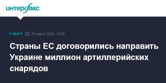 Москва. 20 марта. INTERFAX.RU - Страны ЕС смогли достичь соглашения снабдить Украину 1 млн артиллерийских снарядов на протяжении последующих 12 месяцев. Об этом заявил в понедельник глава Минобороны Эстонии Ханно Певкур "на полях" совместной встречи глав МИД и министров обороны стран Евросоюза.