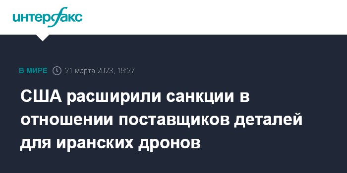 Москва. 21 марта. INTERFAX.RU - Минфин США объявил о санкциях в отношении трех человек и четырех компаний, базирующихся в Иране и Турции, в связи с поставками Тегерану компонентов, которые можно использовать при производстве беспилотников, сообщает Associated Press.