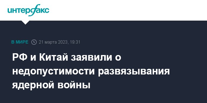 Москва. 21 марта. INTERFAX.RU - Россия и Китай заявили о недопустимости развязывания ядерной войны, в которой не может быть победителей, призвали все ядерные державы не размещать оружие за пределами своих территорий и вывезти его из-за рубежа.