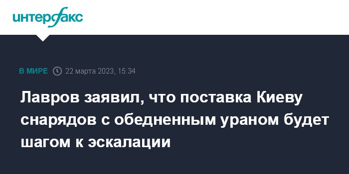 Москва. 22 марта. INTERFAX.RU - Поставки Великобританией Украине снарядов, содержащих обедненный уран, выведет эскалацию конфликта на новый и очень серьезный уровень, заявил глава МИД РФ Сергей Лавров.