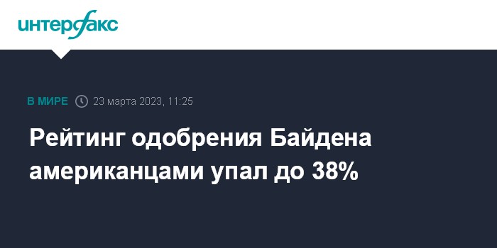 Москва. 23 марта. INTERFAX.RU - Рейтинг одобрения работы президента США Джо Байдена на посту главы государства опустился до 38%, это практически самый низкий уровень за весь его срок, сообщает в четверг Associated Press.