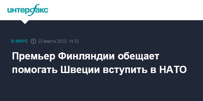Москва. 23 марта. INTERFAX.RU - В Финляндии рассчитывают на быстрое вступление в НАТО и в дальнейшем будут готовы помогать Швеции тоже вступить в альянс, заявила в четверг премьер Финляндии Санна Марин.