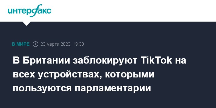Москва. 23 марта. INTERFAX.RU - В Великобритании из соображений безопасности заблокируют приложение TikTok на всех устройствах и в сетях, которые используются в британском парламенте, сообщает в четверг Sky News.