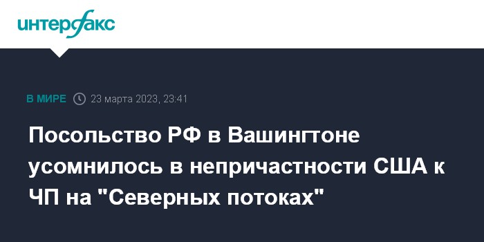 Москва. 23 марта. INTERFAX.RU - Посольство России в Вашингтоне в комментарии, опубликованном в телеграм-канале дипломатической миссии, отмечает, что заявления американских чиновников о непричастности государственных структур США к диверсиям на "Северных потоках" не вызывают доверия.