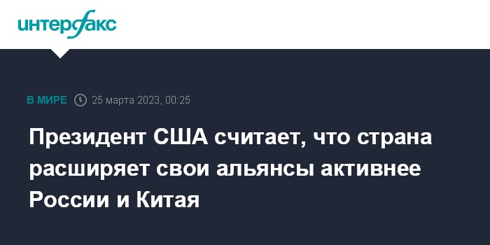 Москва. 25 марта. INTERFAX.RU - США и их партнеры расширяют сеть союзников успешнее России и Китая, заявил американский президент Джо Байден.