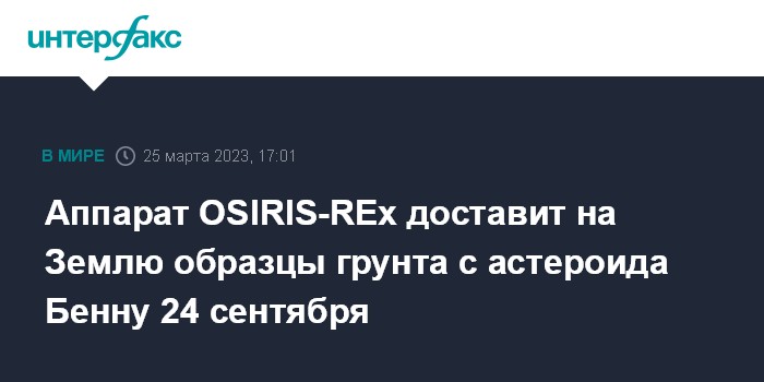 Москва. 25 марта. INTERFAX.RU - Американская межпланетная станция OSIRIS-REx, собравшая образцы грунта с астероида Бенну, находящегося в 333 млн км от Земли, доставит их на Землю 24 сентября, сообщило НАСА.
