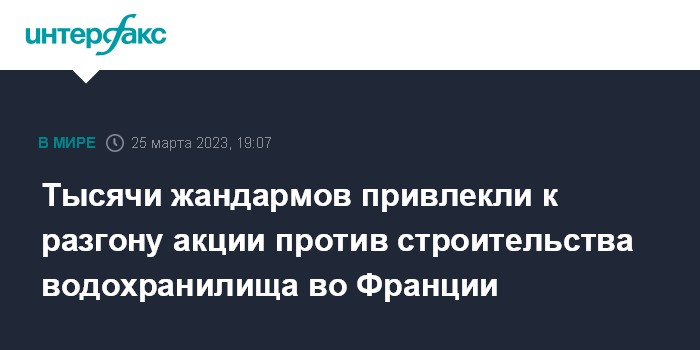 Москва. 25 марта. INTERFAX.RU - Более 3 тыс. сотрудников жандармерии задействованы в разгоне масштабной акции протеста против властей в районе города Сент-Солин на западе Франции, сообщило в субботу местное телевидение.