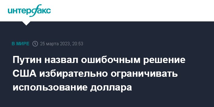 Москва. 25 марта. INTERFAX.RU - США совершают ошибку, ограничивая использование доллара в тех странах, которые им не нравятся, заявил президент РФ Владимир Путин.