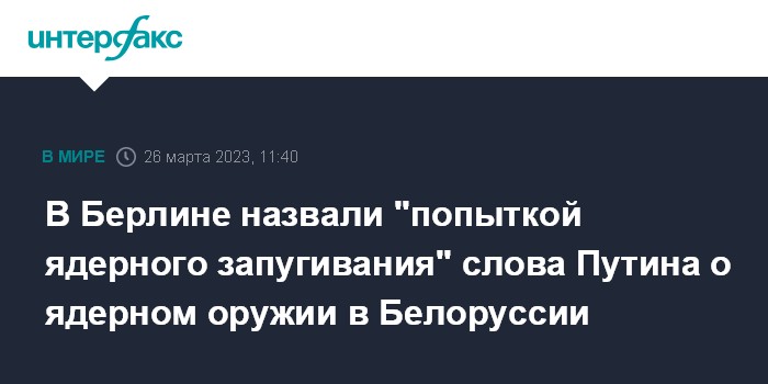 Москва. 26 марта. INTERFAX.RU - МИД Германии назвал заявление президента России Владимира Путина о размещении тактического ядерного оружия в Белоруссии "продолжающейся попыткой ядерного запугивания", сообщает немецкая газета Welt.