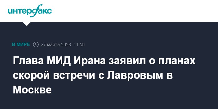 Москва. 27 марта. INTERFAX.RU - Глава МИД Ирана Хосейн Амир Абдоллахиан в понедельник заявил, что в скором времени планирует провести встречу с главой МИД РФ Сергеем Лавровым в Москве.