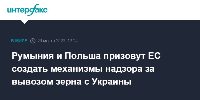 "Румыния и Польша попросят Еврокомиссию, исполнительный орган ЕС, разработать механизмы, которые помогут наладить надзор за экспортом зерна с Украины и избежать демпинговых цен, которые нанесли бы ущерб местным фермерам, заявил Чука во вторник на совместной пресс-конференции с премьером Польши Матеушем Моравецким в Бухаресте", - информирует агентство.